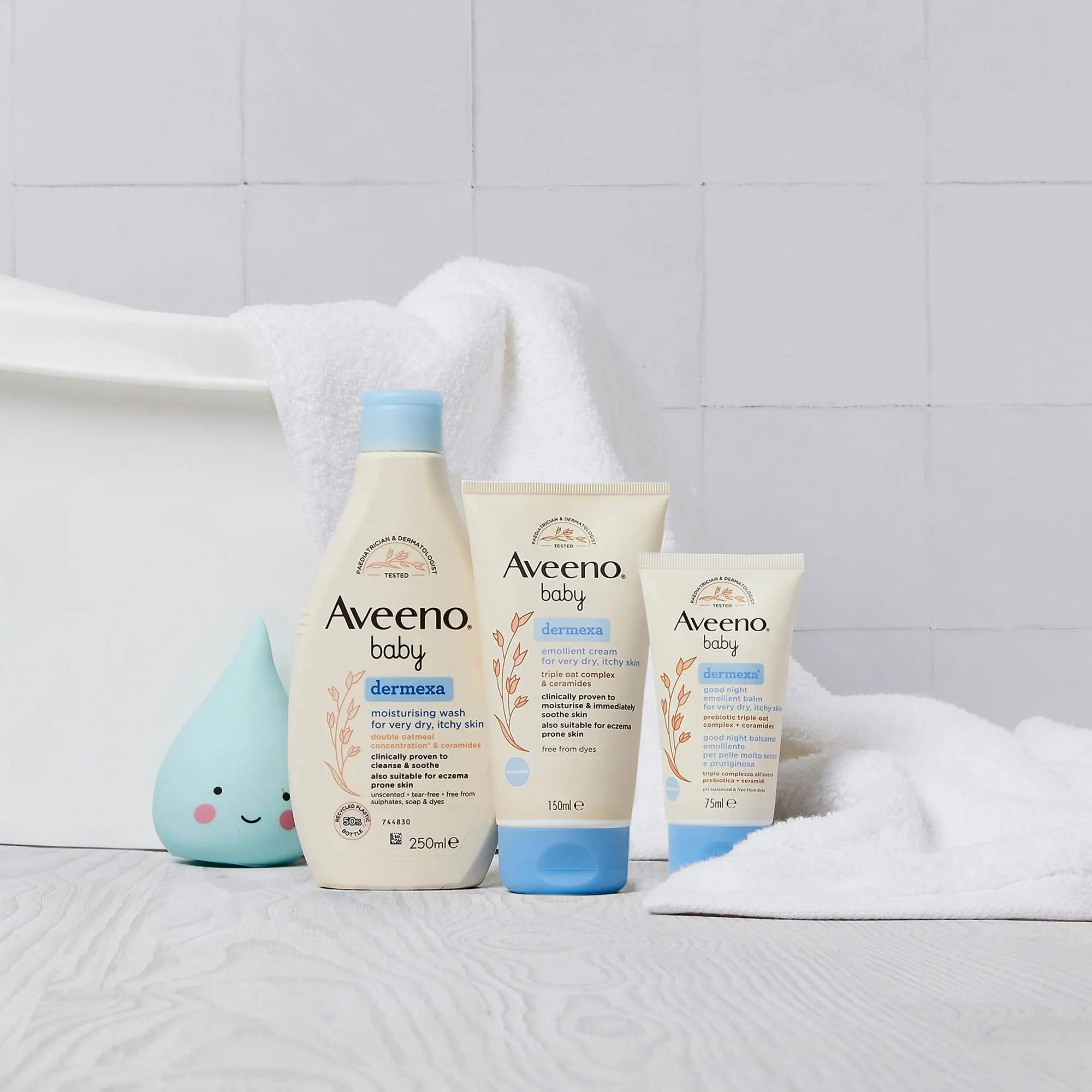 Use moisturising products and try to avoid over-perfumed products. AVEENO® Baby Dermexa Moisturising Wash is gentle on a baby’s skin and paraben-free. Let your baby enjoy warm water for just a few minutes in the bath or a shower, so skin won’t dry out. Always rinse thoroughly, pat all areas dry and immediately moisturise.