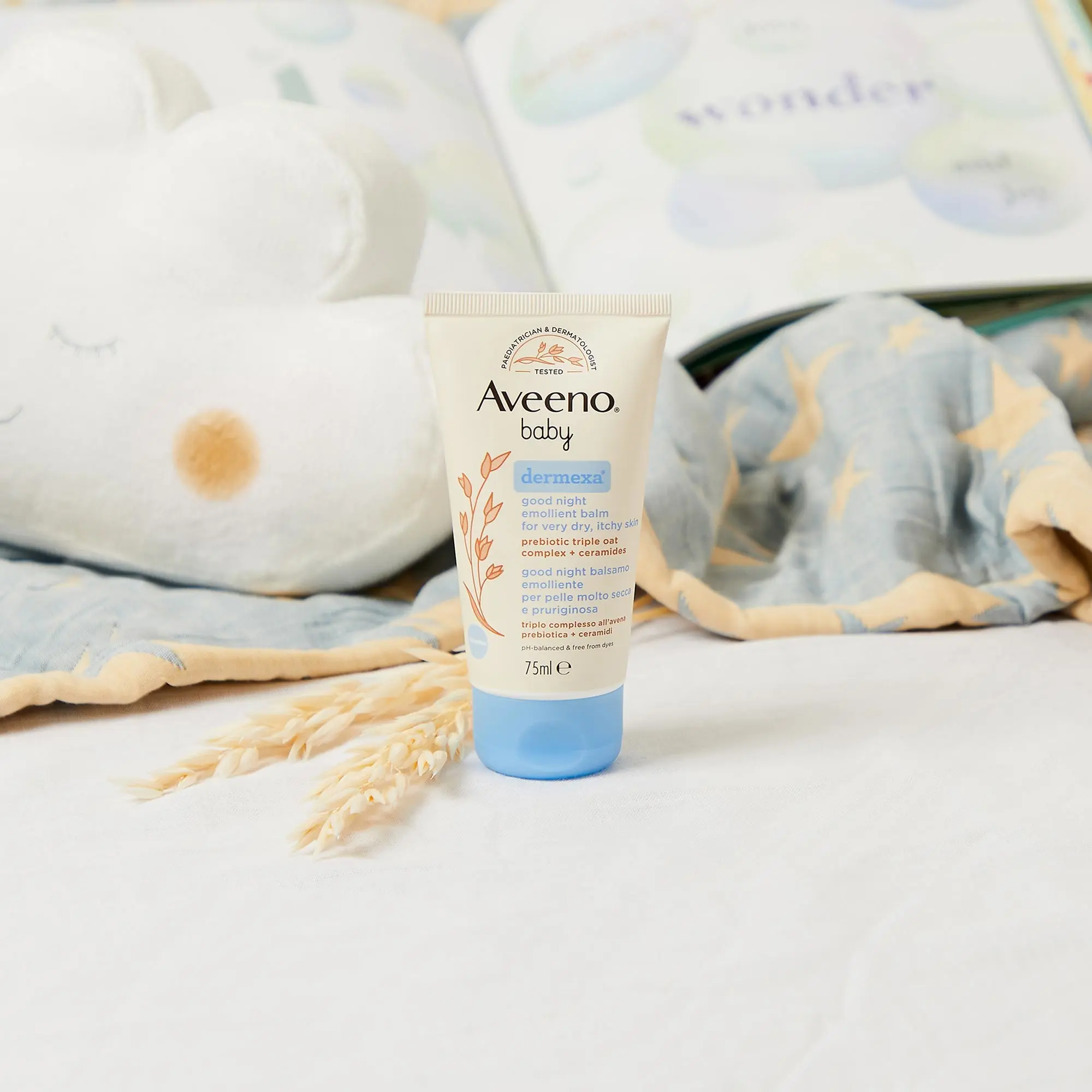 Make sure nappies and clothing are changed regularly to avoid trapped moisture and keep the skin clean. For more peaceful nighttimes, AVEENO® Baby Dermexa Good Night Emollient Balm, can help to manage dry, itchy skin and offer some relief throughout the night. It contains oat extract, oat oil and colloidal oatmeal and is clinically proven to help restore the skin's barrier.